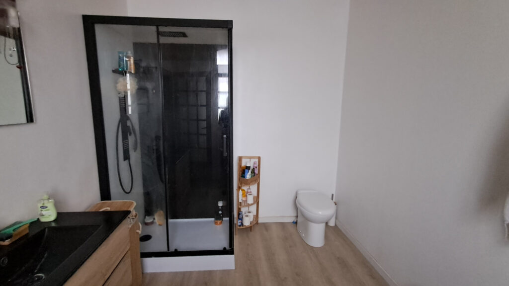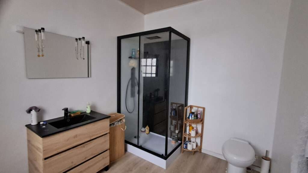 La salle de douche récemment rénovée, est équipée d’une VMC, garantissant confort et bonne ventilation.