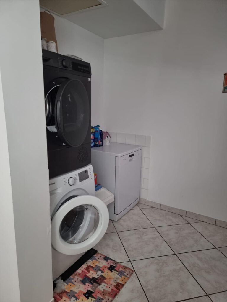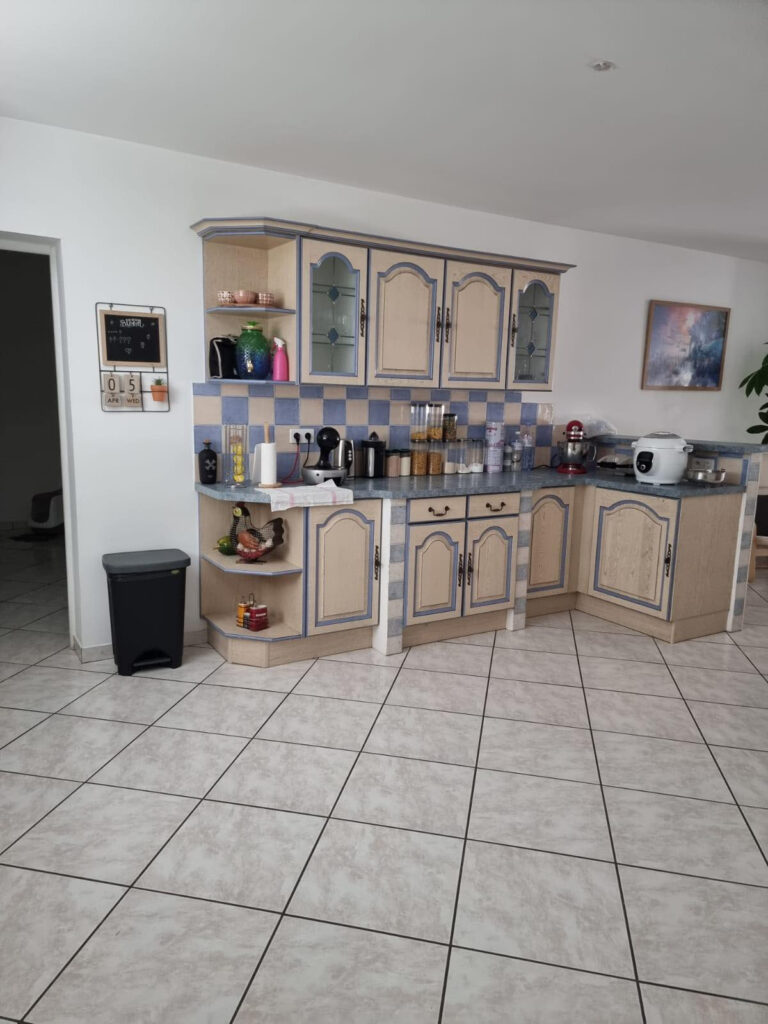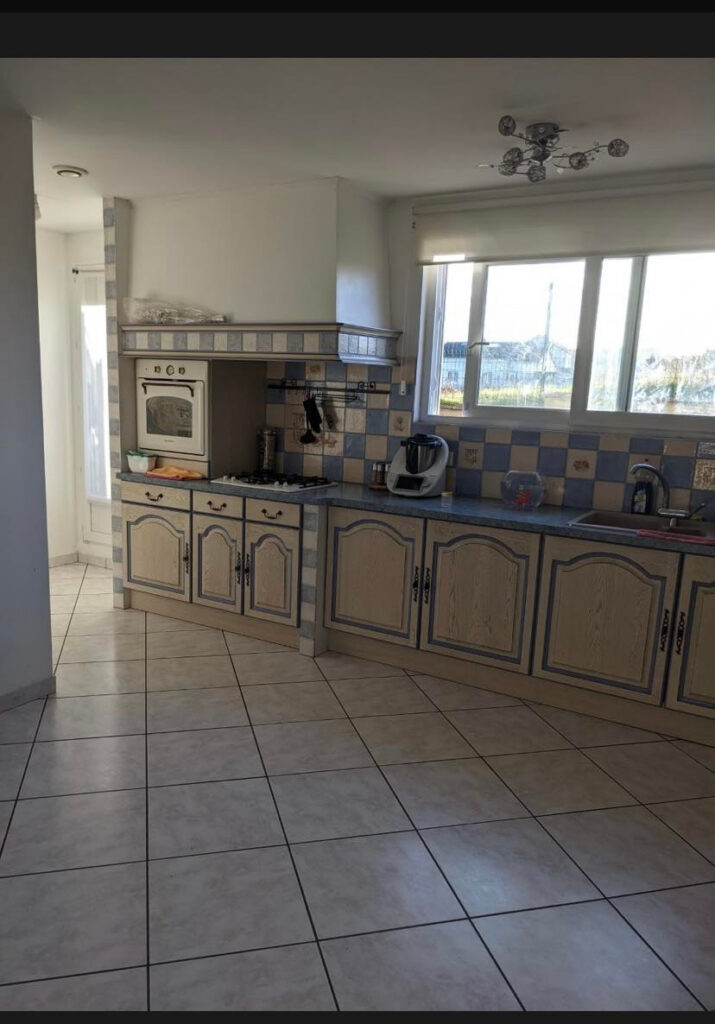 Un tres beau sejour avec cheminée et cuisine ouverte. Espace buanderie et cellier.
