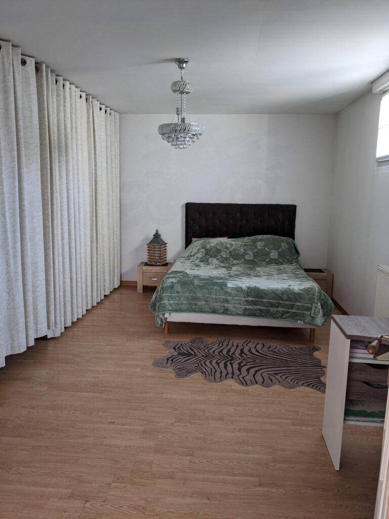 Une chambre et salle de douche au rez-de chaussée.