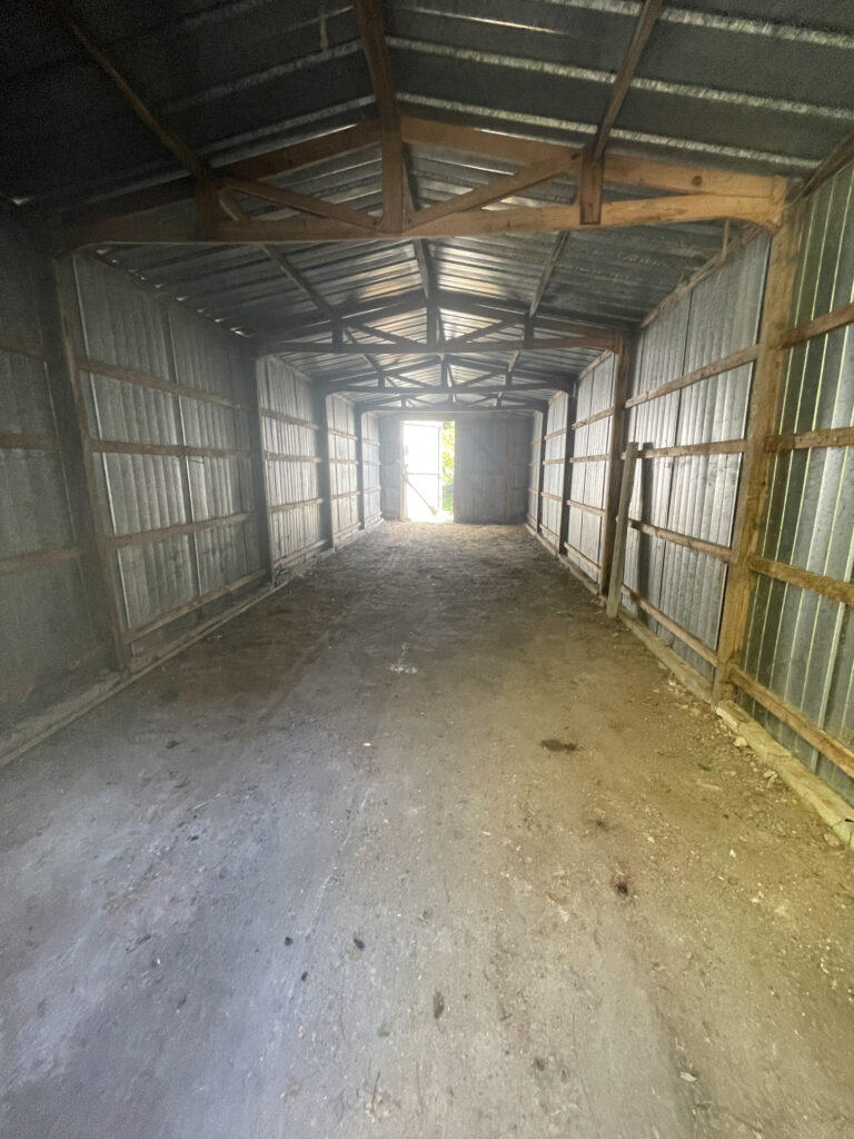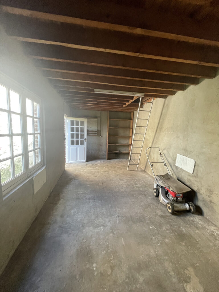 Garage avec grenier et un hangar de 50 m2 offrant un grand potentiel de rangement ou d’aménagement.