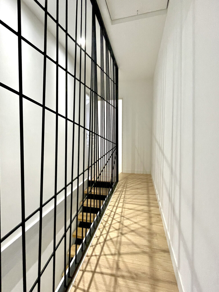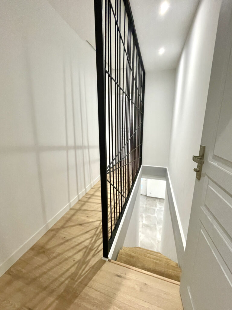 À l’étage : un palier avec garde corps de qualité et sur mesure apporte du cachet, WC, 2 chambres, une conçue avec du rangement, une avec sa propre petite salle d’eau.