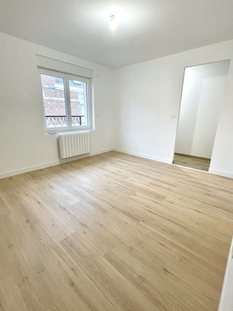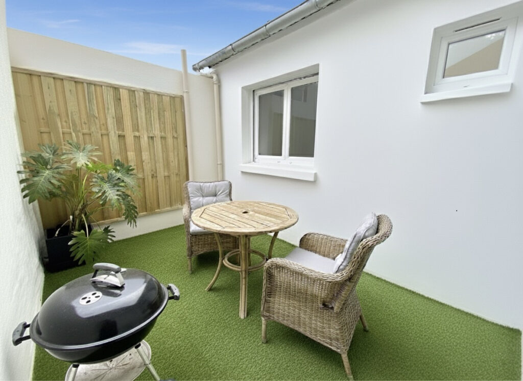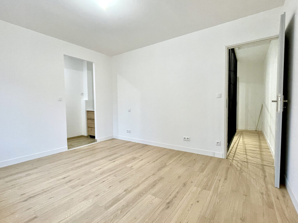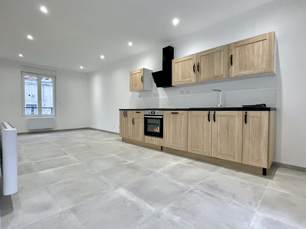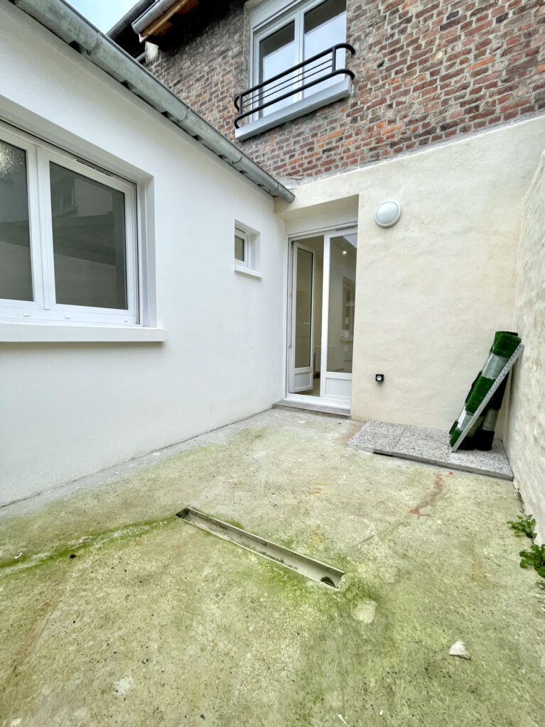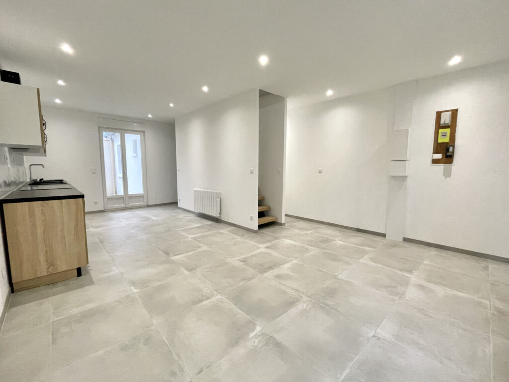Séjour avec cuisine ouverte : 30 m2, espace laverie, WC, salle d’eau, belle cour.