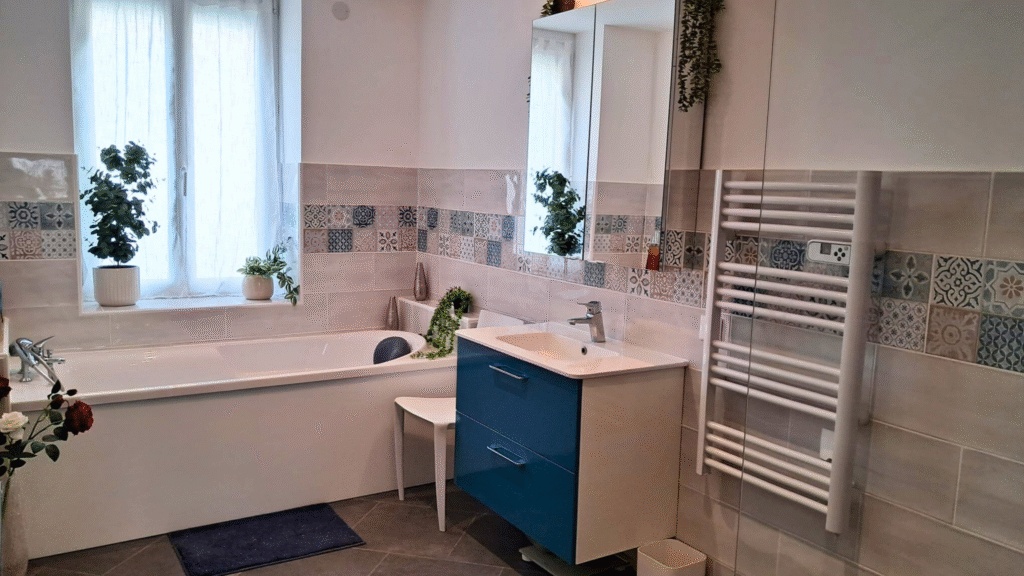 deux chambres dont une avec dressing, wc avec lave-mains, grande salle de bains avec baignoire et douche à l’italienne et placard de rangement.