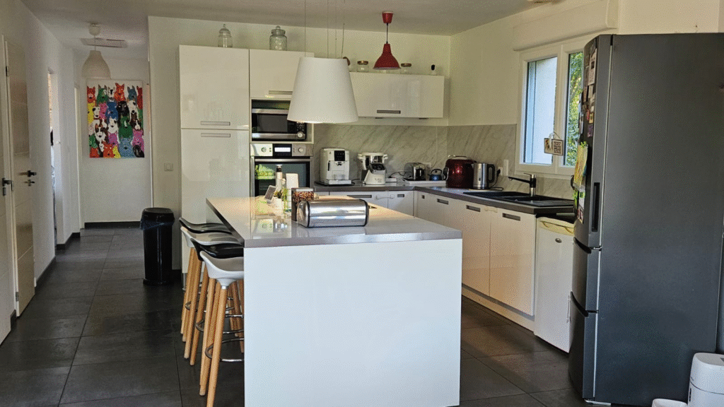 Elle comprend une spacieuse pièce de vie de 60 m2 avec cuisine entièrement équipée ouverte sur le séjour très lumineux, idéal pour recevoir famille et amis.
