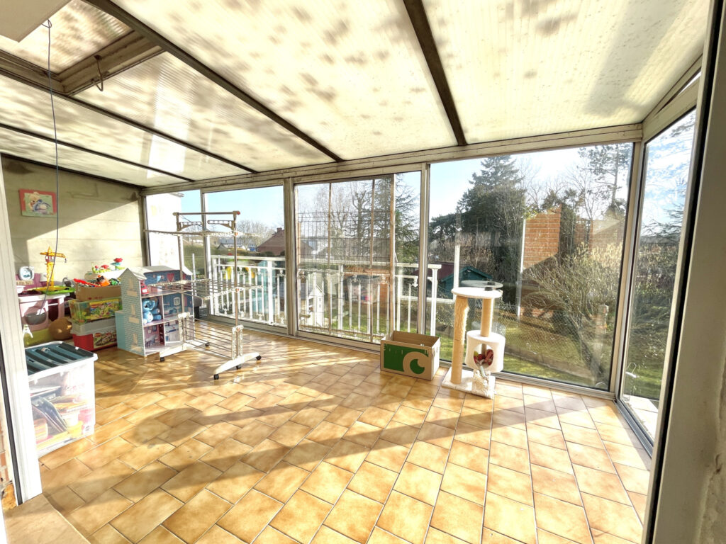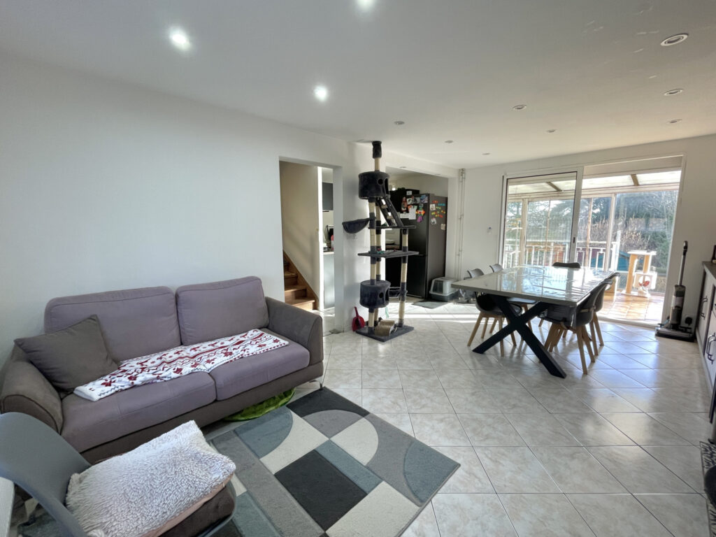 Entrée, WC, séjour ouvert sur cuisine équipée récente, véranda. À l’étage 2 chambres et un bureau ou chambre d’enfant, salle d’eau.