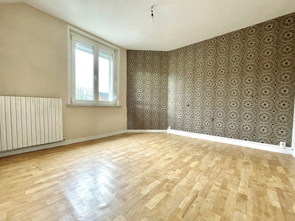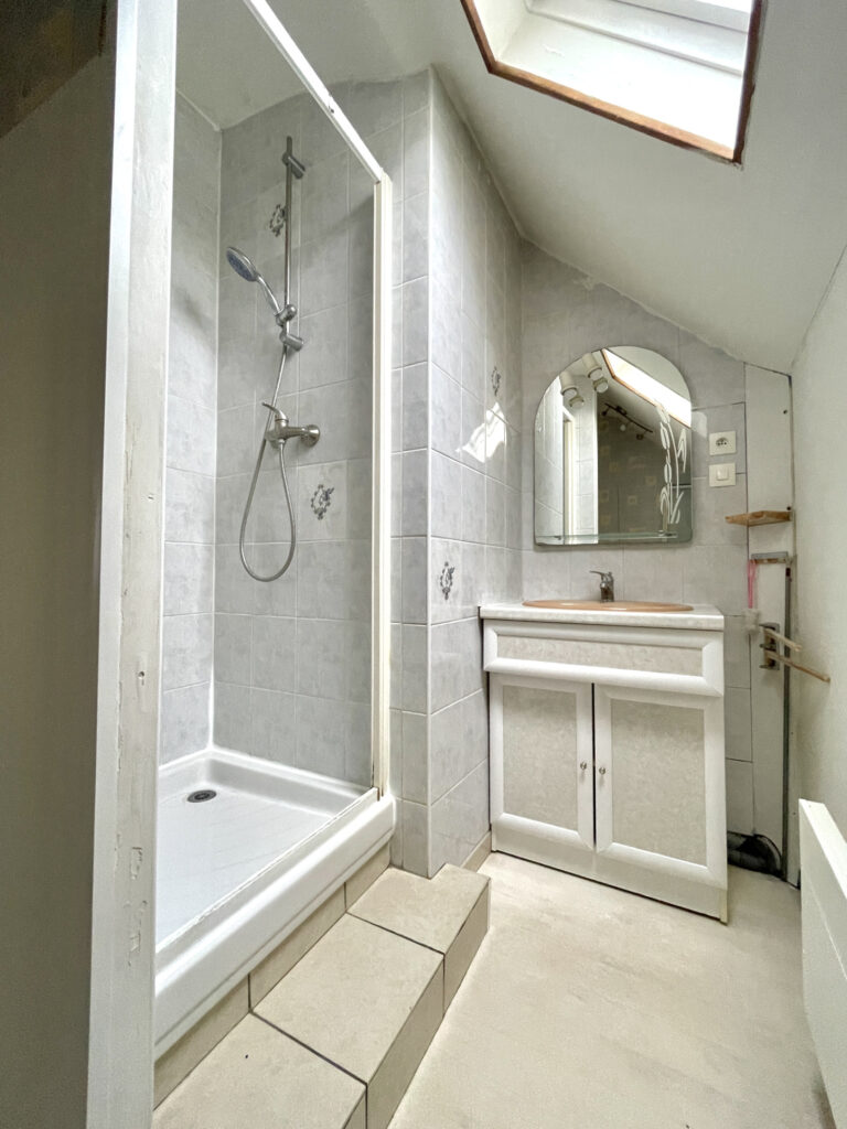 À l’étage : salle d’eau, 2 belles chambres de 14 m2, bureau ou petite chambre.