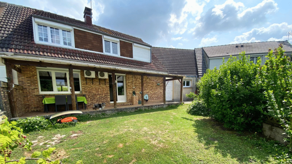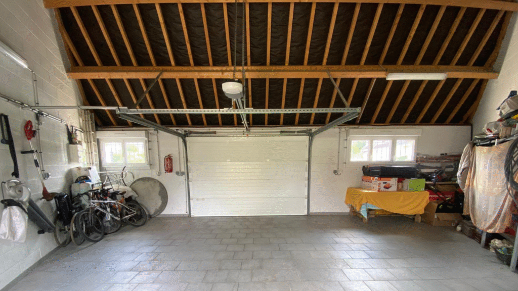 Un grand garage de 50 m2 est attenant à la maison avec porte motorisée et porte de service à l’arrière.