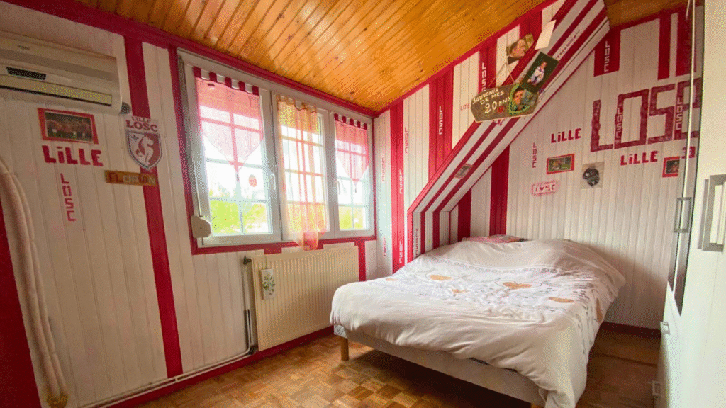 A l’étage (plancher beton), couloir qui distribue 4 chambres, une salle de bains.