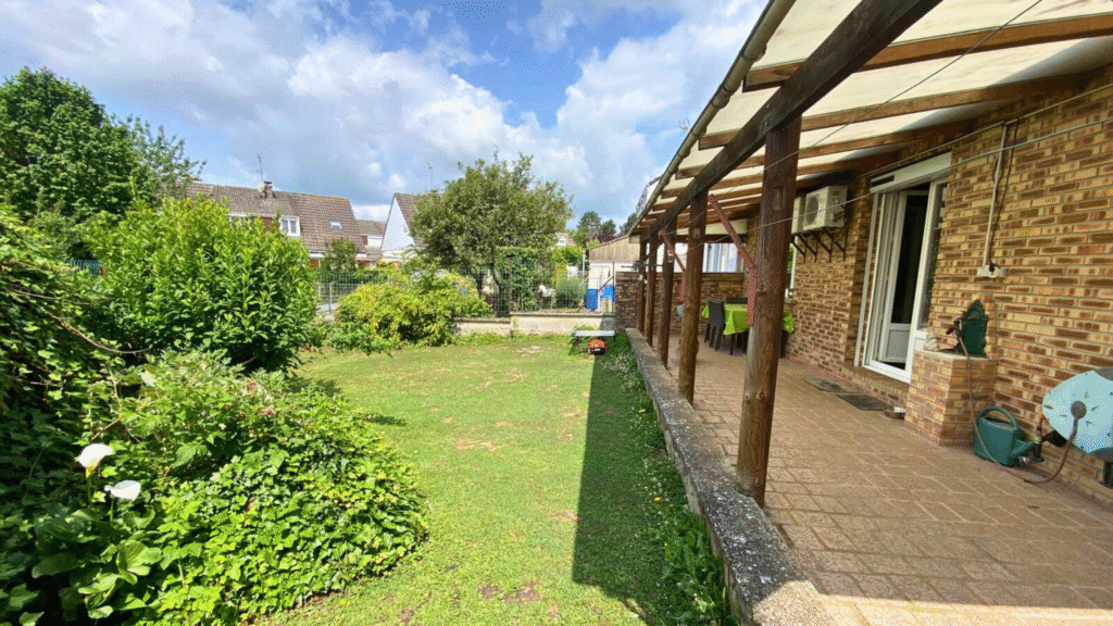 Agréable terrain clos d’environ 100 m2 avec terrasse et pergola.