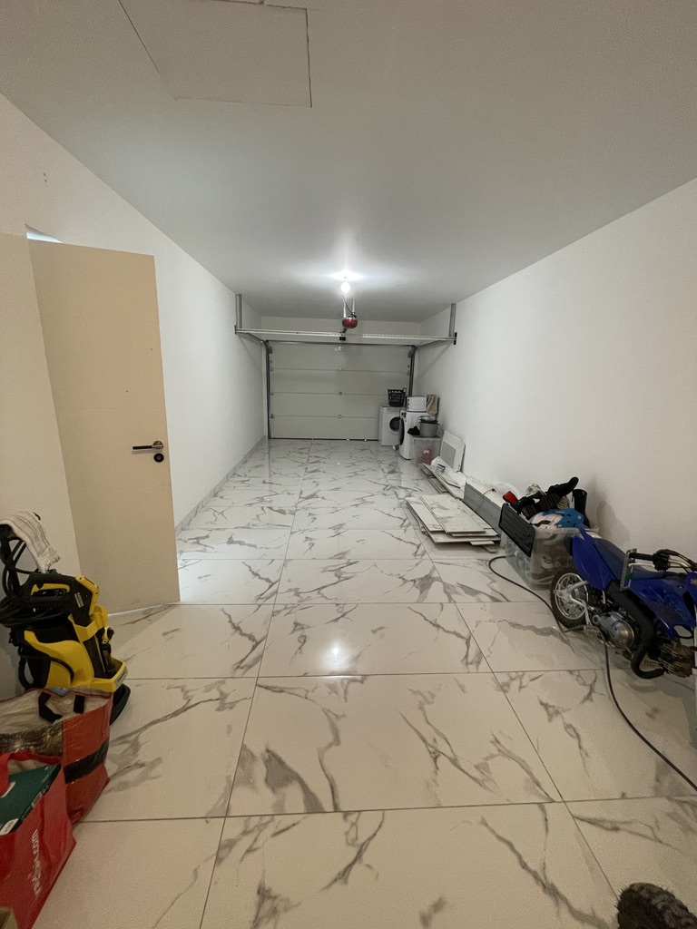 Un garage de 30 m2 complètement carrelé avec coin buanderie avec porte donnant sur la pièce de vie.